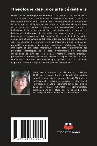 Le livre intitulé "Rheology of Cereal Products" est structuré en trois chapitres : technologies dans l'industrie de la meunerie et des produits de boulangerie, détermination des propriétés rhéologiques de la pâte pendant le pétrissage, et rhéologie et recherche sur la qualité des aliments à base de céréales. Le chapitre 1 comprend les sous-chapitres suivants : technologie de la meunerie et de la croupe, technologie des produits de boulangerie, technologie de fabrication du pain et des produits de boulangerie, technologie de fabrication des pâtes, technologie de fabrication des biscuits et technologie de fabrication des produits à base de farine en vrac. Le chapitre 2 comprend les sous-chapitres suivants : rhéologie, propriétés rhéologiques de la pâte, grandeurs rhéologiques, facteurs influençant les propriétés rhéologiques de la pâte, détermination des propriétés rhéologiques de la pâte, détermination des propriétés rhéologiques de pétrissage de la pâte, méthode pharyngographique, principe de la méthode, dispositifs, procédure, expression des résultats, conclusions, méthode consistographique, principe de la méthode, dispositifs, procédure, expression des résultats, conclusions.