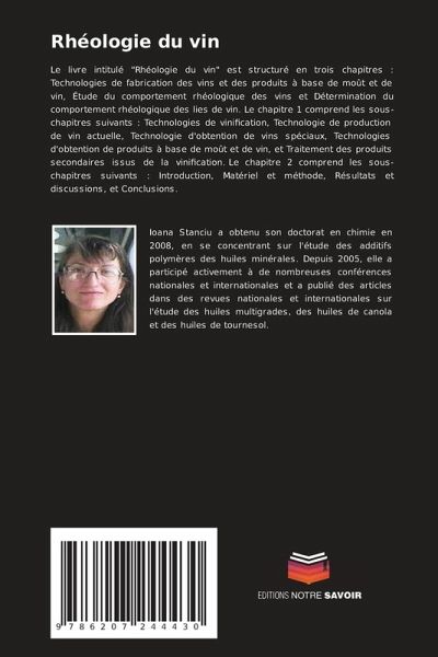 Le livre intitulé "Rhéologie du vin" est structuré en trois chapitres : Technologies de fabrication des vins et des produits à base de moût et de vin, Étude du comportement rhéologique des vins et Détermination du comportement rhéologique des lies de vin. Le chapitre 1 comprend les sous-chapitres suivants : Technologies de vinification, Technologie de production de vin actuelle, Technologie d'obtention de vins spéciaux, Technologies d'obtention de produits à base de moût et de vin, et Traitement des produits secondaires issus de la vinification. Le chapitre 2 comprend les sous-chapitres suivants : Introduction, Matériel et méthode, Résultats et discussions, et Conclusions.