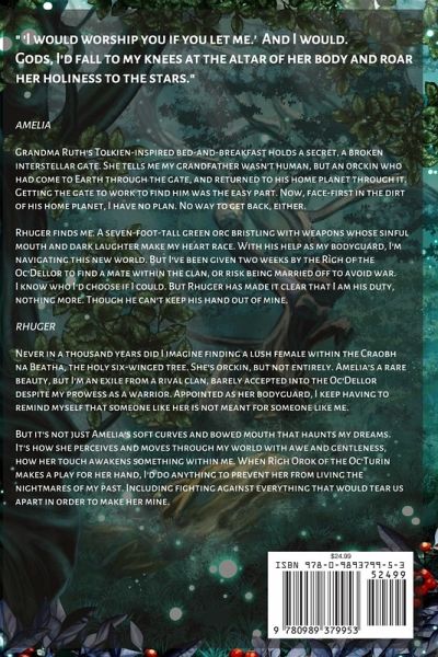 Fans of Finley Fenn, Zoe Ashwood, Tolkien, and Ruby Dixon will love this epic sci-fi fantasy monster romance series! "'I would worship you if you let me.' And I would. Gods, I'd fall to my knees at the altar of her body and roar her holiness to the stars." AMELIA Grandma Ruth's Tolkien-inspired bed-and-breakfast holds a secret, a broken interstellar gate. She tells me my grandfather wasn't human, but an orckin who had come to Earth through the gate, and returned to his home planet through it. Getting the gate to work to find him was the easy part. Now, face-first in the dirt of his home planet, I have no plan. No way to get back, either. Rhuger finds me. A seven-foot-tall green orc bristling with weapons whose sinful mouth and dark laughter make my heart race. With his help as my bodyguard, I'm navigating this new world. But I've been given two weeks by the Rìgh of the Oc'Dellor to find a mate within the clan, or risk being married off to avoid war. I know who I'd choose if I could. But Rhuger has made it clear that I am his duty, nothing more. Though he can't keep his hand out of mine. RHUGER Never in a thousand years did I imagine finding a lush female within the Craobh na Beatha, the holy six-winged tree. She's orckin, but not entirely. Amelia's a rare beauty, but I'm an exile from a rival clan, barely accepted into the Oc'Dellor despite my prowess as a warrior. Appointed as her bodyguard, I keep having to remind myself that someone like her is not meant for someone like me. But it's not just Amelia's soft curves and bowed mouth that haunts my dreams. It's how she perceives and moves through my world with awe and gentleness, how her touch awakens something within me. When Rìgh Orok of the Oc'Turin makes a play for her hand, I'd do anything to prevent her from living the nightmares of my past. Including fighting against everything that would tear us apart in order to make her mine. This is a 180,000 word, full-length, slow-burn, high heat, sci-fi alien orc romance with a plus-sized sunshine autistic FMC, grumpy morally grey MMC, intense world-building, epic fantasy, plenty of simping, hurt/comfort, who hurt you?, fated mates, and a guaranteed HEA. The Content Awareness section is on the author's website and at the back of the book.