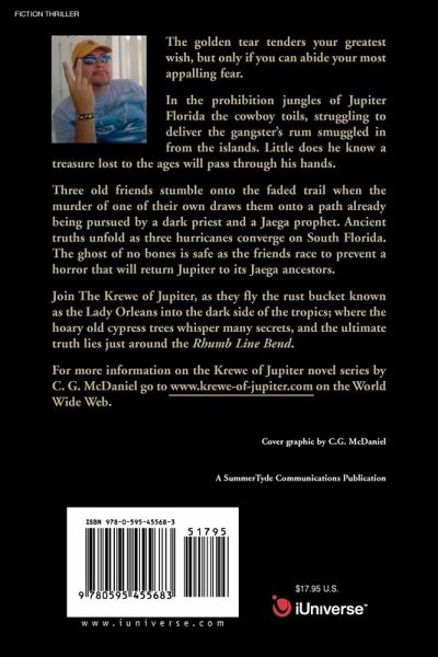 The golden tear tenders your greatest wish, but only if you can abide your most appalling fear. In the prohibition jungles of Jupiter Florida the cowboy toils, struggling to deliver the gangster's rum smuggled in from the islands. Little does he know a treasure lost to the ages will pass through his hands. Three old friends stumble onto the faded trail when the murder of one of their own draws them onto a path already being pursued by a dark priest and a Jaega prophet. Ancient truths unfold as three hurricanes converge on South Florida. The ghost of no bones is safe as the friends race to prevent a horror that will return Jupiter to its Jaega ancestors. Join The Krewe of Jupiter, as they fly the rust bucket known as the Lady Orleans into the dark side of the tropics; where the hoary old cypress trees whisper many secrets, and the ultimate truth lies just around the Rhumb Line Bend. "For more information on the Krewe of Jupiter novel series by C. G. McDaniel go to www.krewe-of-jupiter.com on the World Wide Web."