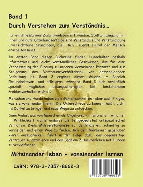 Durch Verstehen zum Verständnis...Für ein stressarmes Zusammenleben mit Hunden, Spaß am Umgang mit ihnen und gute Erziehungserfolge sind Verständnis und Verständigung unverzichtbare Grundlagen, die sich zuerst einmal der Mensch erarbeiten muss. Im ersten Band dieser Buchreihe finden Hundehalter deshalb informatives und leicht verständliches Basiswissen, das für eine Verbesserung der Bindung zu unseren vierbeinigen Partnern und zur Steigerung des Vertrauensverhältnisses von entscheidender Bedeutung ist. Band 2 ergänzt dieses Wissen im Bereich Gesundheitsvor- und -fürsorge, während Band 3 sich schließlich speziell möglichen Lösungsstrategien bei bestehendem Problemverhalten widmet.Menschen und Hunde haben viele Gemeinsamkeiten - aber auch Einiges, was sie voneinander trennt. Die Unterschiede zu kennen, heißt, Licht ins Dunkel zu bringen und neue Wege zu entdecken. Denn Vieles, was von Menschen als Ungehorsam interpretiert wird, ist in Wirklichkeit nichts anderes als fehlgedeutetes artspezifisches Verhalten. Diese Missverständnisse zu identifizieren, zukünftig zu vermeiden und einen Weg zu finden, sich dem Vierbeiner gegenüber klarer auszudrücken, führt in der Folge dazu, das gegenseitige Vertrauen zu optimieren und den Spaß am Zusammenleben mit Hunden zu vervielfachen. Miteinander leben - voneinander lernenBand 1: Basiswissen
