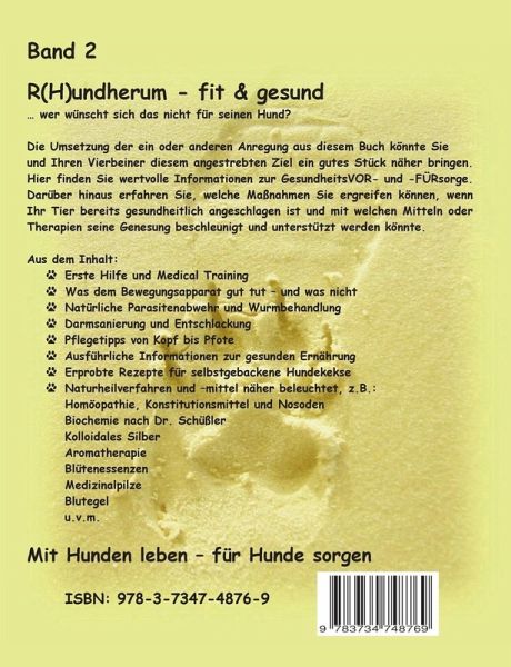 R(H)undherum - fit & gesund ... wer wünscht sich das nicht für seinen Hund?Die Umsetzung der ein oder anderen Anregung aus diesem Buch könnte Sie und Ihren Vierbeiner diesem angestrebten Ziel ein gutes Stück näher bringen. Hier finden Sie wertvolle Informationen zur GesundheitsVOR- und -FÜRsorge. Darüber hinaus erfahren Sie, welche Maßnahmen Sie ergreifen können, wenn Ihr Tier bereits gesundheitlich angeschlagen ist und mit welchen Mitteln oder Therapien seine Genesung beschleunigt und unterstützt werden könnte. Aus dem Inhalt:_Erste Hilfe und Medical Training_Was dem Bewegungsapparat gut tut - und was nicht_Natürliche Parasitenabwehr und Wurmbehandlung_Darmsanierung und Entschlackung_Pflegetipps von Kopf bis Pfote_Ausführliche Informationen zur gesunden Ernährung_Erprobte Rezepte für selbstgebackene Hundekekse_Naturheilverfahren und -mittel näher beleuchtet, z.B.: Homöopathie, Konstitutionsmittel und Nosoden Biochemie nach Dr. Schüßler Kolloidales Silber Aromatherapie Blütenessenzen Medizinalpilze Blutegel u.v.m.Mit Hunden leben - für Hunde sorgen