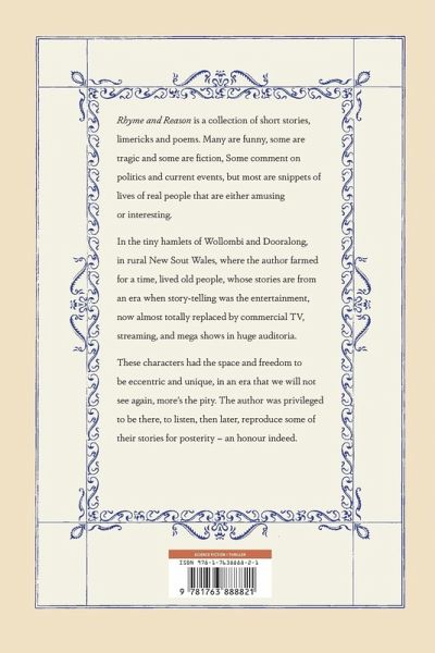 Rhyme and Reason is a collection of short stories, limericks and poems. Many are funny, some are tragic and some are fiction, Some comment on politics and current events, but most are snippets of lives of real people that are either amusing or interesting. In the tiny hamlets of Wollombi and Dooralong, in rural New Sout Wales, where the author farmed for a time, lived old people, whose stories are from an era when story-telling was the entertainment, now almost totally replaced by commercial TV, streaming, and mega shows in huge auditoria. These characters had the space and freedom to be eccentric and unique, in an era that we will not see again, more's the pity. The author was privileged to be there, to listen, then later, reproduce some of their stories for posterity - an honour indeed.