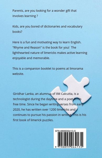 Parents, are you looking for a wonder gift that involves learning ? Kids, are you bored of dictionaries and vocabulary books? Here is a fun and motivating way to learn English. "Rhyme and Reason" is the book for you! The lighthearted nature of limericks makes active learning enjoyable and memorable. It is a companion booklet to poems at limorama website.