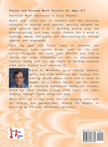 Rhyme and Reason: Math Puzzles for Ages 6-7 Fun-Filled Math Adventures in Every Rhyme! Spark your child's love for numbers with this whimsical collection of rhyming math puzzles, specially designed for early learners ages 6 to 7. Blending poetry, play, and problem-solving, each page invites children into a world of counting, adding, subtracting, and skip-counting-all through laughter and imagination. From toy guns and French toast to narwhals and microphones, every puzzle brings math to life with colorful characters and clever clues. Whether your child is solving how many milkshakes are left,…mehr