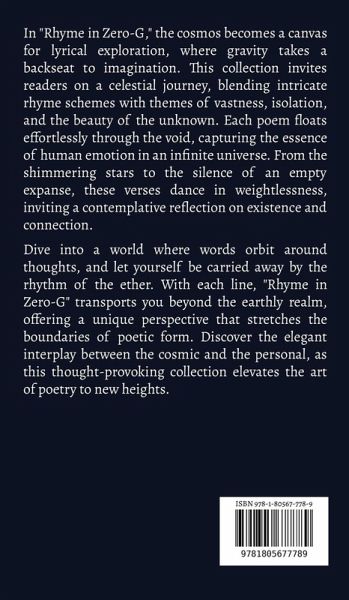 In "Rhyme in Zero-G," the cosmos becomes a canvas for lyrical exploration, where gravity takes a backseat to imagination. This collection invites readers on a celestial journey, blending intricate rhyme schemes with themes of vastness, isolation, and the beauty of the unknown. Each poem floats effortlessly through the void, capturing the essence of human emotion in an infinite universe. From the shimmering stars to the silence of an empty expanse, these verses dance in weightlessness, inviting a contemplative reflection on existence and connection. Dive into a world where words orbit around thoughts, and let yourself be carried away by the rhythm of the ether. With each line, "Rhyme in Zero-G" transports you beyond the earthly realm, offering a unique perspective that stretches the boundaries of poetic form. Discover the elegant interplay between the cosmic and the personal, as this thought-provoking collection elevates the art of poetry to new heights.