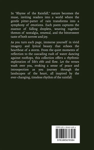 In "Rhyme of the Rainfall," nature becomes the muse, inviting readers into a world where the gentle pitter-patter of rain transforms into a symphony of emotions. Each poem captures the essence of falling droplets, weaving together themes of nostalgia, renewal, and the bittersweet taste of both sorrow and joy. As you turn each page, immerse yourself in vivid imagery and lyrical beauty that echoes the heartbeat of a storm. From the quiet moments of reflection to the cascading rush of water dancing against rooftops, this collection offers a rhythmic exploration of life's ebb and flow. Let the verses wash over you, evoking a sense of peace and introspection as you journey through the landscapes of the heart, all inspired by the ever-changing, timeless rhythm of the rainfall.