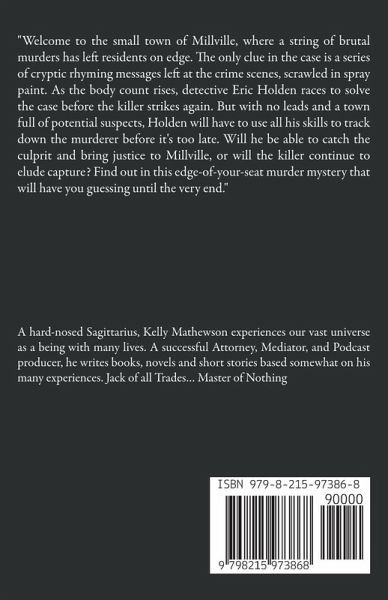 "Welcome to the small town of Millville, where a string of brutal murders has left residents on edge. The only clue in the case is a series of cryptic rhyming messages left at the crime scenes, scrawled in spray paint. As the body count rises, detective Eric Holden races to solve the case before the killer strikes again. But with no leads and a town full of potential suspects, Holden will have to use all his skills to track down the murderer before it's too late. Will he be able to catch the culprit and bring justice to Millville, or will the killer continue to elude capture? Find out in this edge-of-your-seat murder mystery that will have you guessing until the very end."