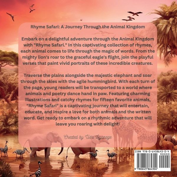 Rhyme Safari: A Journey through the Animal Kingdom Embark on a delightful adventure through the Animal Kingdomwith "Rhyme Safari." In this captivating collection of rhymes, each animal comes to life through the magic of words. From the mighty lion's roar to the graceful eagle's flight, join the playful verses that paint vivid portraits of these incredible creatures. Traverse the plains alongside the majestic elephant and soar through the skies with the agile hummingbird. With each turn of the page, young readers will be transported to a world where animals and poetry dance hand in paw. Featuring charming illustrations and catchy rhymes for fifteen favorite animals, "Rhyme Safari" is a captivating journey that will entertain, educate, and inspire a love for both animals and the written word. Get ready to embark on a rhythmic adventure that will leave you roaring with delight!