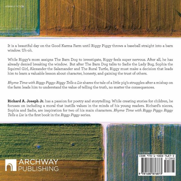 It is a beautiful day on the Good Karma Farm until Riggy Piggy throws a baseball straight into a barn window. Uh-oh. While Riggy's mom assigns The Barn Dog to investigate, Riggy feels super nervous. After all, he has already denied breaking the window. But after The Barn Dog talks to Sadie the Lady Bug, Sophia the Squirrel Girl, Alexander the Salamander and The Rural Turtle, Riggy must make a decision that leads him to learn a valuable lesson about character, honesty, and gaining the trust of others. Rhyme Time with Riggy Piggy: Riggy Tells a Lie shares the tale of a little pig's struggles after a mishap on the farm leads him to understand the value of telling the truth, no matter the consequences.