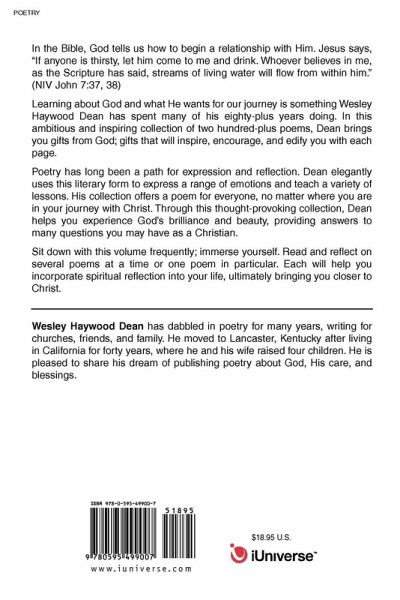 In the Bible, God tells us how to begin a relationship with Him. Jesus says, "If anyone is thirsty, let him come to me and drink. Whoever believes in me, as the Scripture has said, streams of living water will flow from within him." (NIV John 7:37, 38) Learning about God and what He wants for our journey is something Wesley Haywood Dean has spent many of his eighty-plus years doing. In this ambitious and inspiring collection of two hundred-plus poems, Dean brings you gifts from God; gifts that will inspire, encourage, and edify you with each page. Poetry has long been a path for expression and reflection. Dean elegantly uses this literary form to express a range of emotions and teach a variety of lessons. His collection offers a poem for everyone, no matter where you are in your journey with Christ. Through this thought-provoking collection, Dean helps you experience God's brilliance and beauty, providing answers to many questions you may have as a Christian. Sit down with this volume frequently; immerse yourself. Read and reflect on several poems at a time or one poem in particular. Each will help you incorporate spiritual reflection into your life, ultimately bringing you closer to Christ.