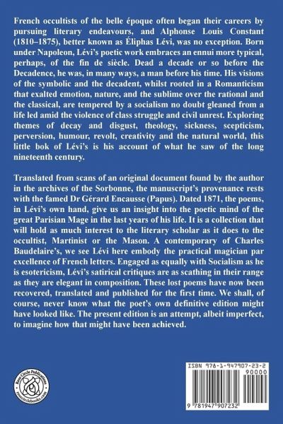 The poems of Éliphas Lévi discovered in a book once owned by Papus, and lodged in the Sorbonne Library. The book contains a Foreword by Mathieu Ravignat on the life of and influences on Lévi, and the poems are presented in English and the original French. French occultists of the belle époque often began their careers by pursuing literary endeavours, and Alphonse Louis Constant (1810-1875), better known as Éliphas Lévi, was no exception. Born under Napoleon, Lévi's poetic work embraces an ennui more typical, perhaps, of the fin de siècle. Dead a decade or so before the Decadence, he was, in many ways, a man before his time. His visions of the symbolic and the decadent, whilst rooted in a Romanticism that exalted emotion, nature, and the sublime over the rational and the classical, are tempered by a socialism no doubt gleaned from a life led amid the violence of class struggle and civil unrest. Exploring themes of decay and disgust, theology, sickness, scepticism, perversion, humour, revolt, creativity and the natural world, this little book of Lévi's is his account of what he saw of the long nineteenth-century. Translated from scans of an original document found by the author in the archives of the Sorbonne, the manuscript's provenance rests with the famed Dr Gérard Encausse (Papus). Dated 1871, the poems, in Lévi's own hand, give us an insight into the poetic mind of the great Parisian Mage in the last years of his life. Reflective and playful, the poems feature an array of names synonymous with mid-nineteenth-century French intellectual life. It is a collection that will hold as much interest to the literary scholar as it does to the occultist, Martinist or the Mason. A contemporary of Charles Baudelaire's, we see Lévi here embody the practical magician par excellence of French letters. Engaged as equally with Socialism as he is esotericism, Lévi's satirical critiques are as scathing in their range as they are elegant in composition. These lost poems have now been recovered, translated and published for the first time. We shall, of course, never know what the poet's own definitive edition might have looked like. The present edition is an attempt, albeit imperfect, to imagine how that might have been achieved.