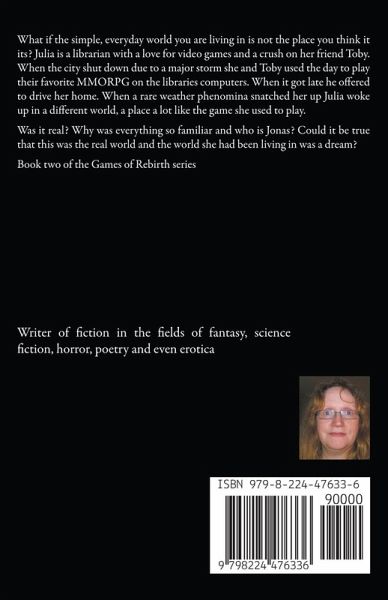 What if the simple, everyday world you are living in is not the place you think it its? Julia is a librarian with a love for video games and a crush on her friend Toby. When the city shut down due to a major storm she and Toby used the day to play their favorite MMORPG on the libraries computers. When it got late he offered to drive her home. When a rare weather phenomina snatched her up Julia woke up in a different world, a place a lot like the game she used to play. Was it real? Why was everything so familiar and who is Jonas? Could it be true that this was the real world and the world she had been living in was a dream? Book two of the Games of Rebirth series