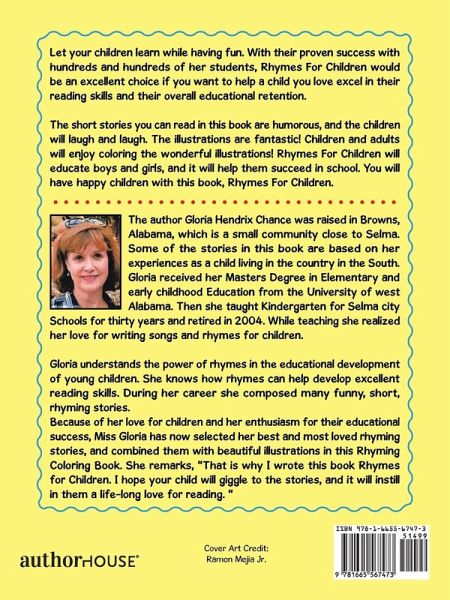 Let your children learn while having fun. With their proven success with hundreds and hundreds of her students, Rhymes For Children would be an excellent choice if you want to help a child you love excel in their reading skills and their overall educational retention. The short stories you can read in this book are humorous, and the children will laugh and laugh. The illustrations are fantastic! Children and adults will enjoy coloring the wonderful illustrations! Rhymes For Children will educate boys and girls, and it will help them succeed in school. You will have happy children with this book, Rhymes For Children.