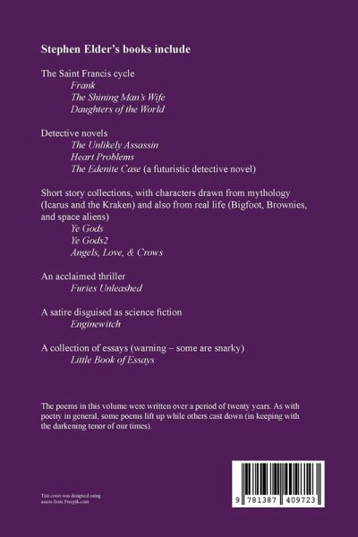 Stephen Elder's books are described at www.stephenelderauthor.com. They can also be purchased directly from Lulu or from amazon.com. His fiction ranges from a trilogy about Saint Francis in the modern world to science fiction to contemporary thrillers and satires. Also included are short story collections featuring characters drawn from mythology (Icarus, the Kraken) and from real life (Bigfoot, Brownies, and space aliens).