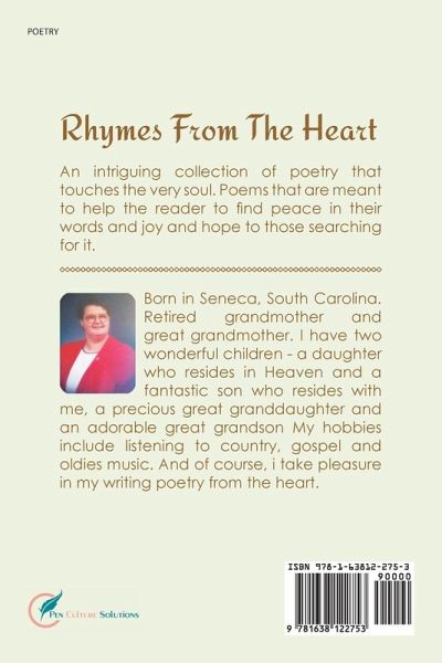 Rhymes From The Heart An Intriguing collection of poetry that touches the very soul. Poems that are meant to help the reader to find peace in their words and joy and hope to those searching for it.