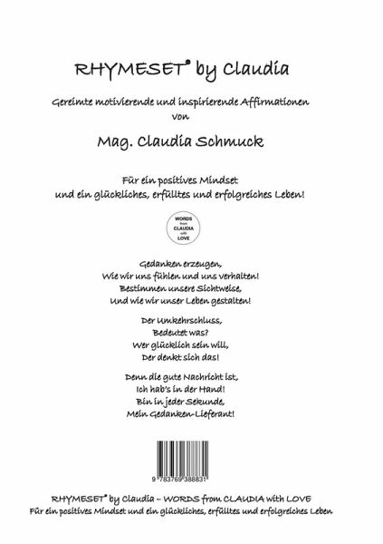 RHYMESET® by Claudia Gereimte motivierende und inspirierende Affirmationen von Mag. Claudia Schmuck Für ein positives Mindset und ein glückliches, erfülltes und erfolgreiches Leben! Gedanken erzeugen, Wie wir uns fühlen und uns verhalten! Bestimmen unsere Sichtweise, Und wie wir unser Leben gestalten! Der Umkehrschluss, Bedeutet was? Wer glücklich sein will, Der denkt sich das! Denn die gute Nachricht ist, Ich habs in der Hand! Bin in jeder Sekunde, Mein Gedanken-Lieferant!
