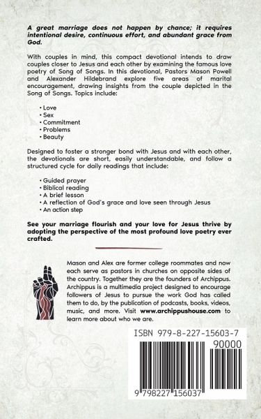 A great marriage does not happen by chance; it requires intentional desire, continuous effort, and abundant grace from God. With couples in mind, this compact devotional intends to draw couples closer to Jesus and closer to each other by examining the famous love poetry of Song of Songs. In this devotional, Pastors Mason Powell and Alexander Hildebrand explore five areas of marital encouragement, drawing insights from the couple depicted in the Song of Songs. Topics include:Love Sex Commitment Problems Beauty Designed to foster a stronger bond with Jesus and with each other, the devotionals are short, easily understandable, and follow a structured cycle for daily readings that include:Guided prayer Assigned biblical text to read A brief lesson applicable to couples from the biblical text A reflection of God's grace and love seen through Jesus An action step for each couple to take together based on that day's reading See your marriage flourish and your love for Jesus thrive by adopting the perspective of the most profound love poetry ever crafted.