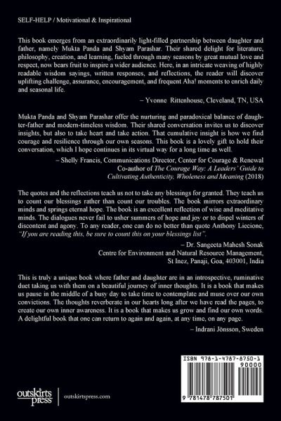 This book emerges from an extraordinarily light-filled partnership between daughter and father, namely Mukta Panda and Shyam Parashar. Their shared delight for literature, philosophy, creation, and learning, fueled through many seasons by great mutual love and respect, now bears fruit to inspire a wider audience. Here, in an intricate weaving of highly readable wisdom sayings, written responses, and reflections, the reader will discover uplifting challenge, assurance, encouragement, and frequent Aha! moments to enrich daily and seasonal life. - Yvonne Rittenhouse, Cleveland, TN, USA Mukta Panda and Shyam Parashar offer the nurturing and paradoxical balance of daughter-father and modern-timeless wisdom. Their shared conversation invites us to discover insights, but also to take heart and take action. That cumulative insight is how we find courage and resilience through our own seasons. This book is a lovely gift to hold their conversation, which I hope continues in its virtual way for a long time as well. - Shelly Francis, Communications Director, Center for Courage & Renewal Co-author of The Courage Way: A Leaders' Guide to Cultivating Authenticity, Wholeness and Meaning (2018) The quotes and the reflections teach us not to take any blessings for granted. They teach us to count our blessings rather than count our troubles. The book mirrors extraordinary minds and springs eternal hope. The book is an excellent reflection of wise and meditative minds. The dialogues never fail to usher summers of hope and joy or to dispel winters of discontent and agony. To any reader, one can do no better than quote Anthony Liecione, "If you are reading this, be sure to count this on your blessings list". - Dr. Sangeeta Mahesh Sonak Centre for Environment and Natural Resource Management, St Inez, Panaji, Goa, 403001, India This is truly a unique book where father and daughter are in an introspective, ruminative duet taking us with them on a beautiful jou