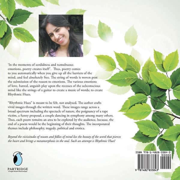 'In the moments of sordidness and tumultuous emotions, poetry creates itself'. Thus, poetry comes to you automatically when you give up all the barriers of the mind, and feel absolutely free. The string of words is woven post the submission of reason to emotions. The various emotions of love, hatred, anguish play upon the recesses of the subconscious mind like the strings of a guitar to create a music of words; to create Rhythmic Hues. "Rhythmic Hues" is meant to be felt, not analysed. The author crafts vivid images through the written word. These images range across a broad spectrum including the spectacle of nature, the poignancy of a rape victim, a funny proposal, a couple dancing in symphony among many others. Thus, each poem remains an area to be explored by the audience, because, the end of a poem would be the beginning of their thoughts. The incorporated themes include philosophy, tragedy, love, spirituality and erotica. "Beyond the vicissitudes of reason and follies of the mind lies the beauty of the word that pierces the heart and brings a metamorphosis in the soul. Such an attempt is Rhythmic Hues! "