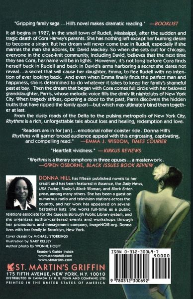 It all began in 1927, in the small town of Rudell, Mississippi, after the sudden and tragic death of Cora Harvey's parents. She has nothing left except her burning desire to become a singer. But her dream will never come true in Rudell, especially if she marries the man she adores, Dr. David Mackey. So when she sets out for Chicago, everyone in the close knit community, including David believes that the next time they see Cora, her name will be in lights. However, it's not long before Cora finds herself back in Rudell and back in David's arms harboring a secret she dare not reveal. . .A secret that will cause her daughter, Emma to flee Rudell with no intention of ever looking back. And even when Emma finds the perfect man and happiness at last, she is determined to do whatever it takes to keep her family's shameful past at bay. Then the dream that began with Cora comes full circle with her beloved granddaughter Parris whose melodic voice fills the dimly lit nightclubs of New York City. Yet, when tragedy strikes, opening a door to the past, Parris discovers the hidden truths that have ripped the family apart---but which may ultimately bind them together at last. From the dusty roads of the Delta to the pulsing metropolis of New York City, Rhythms is a rich, unforgettable tale about loss and healing, redemption and love.