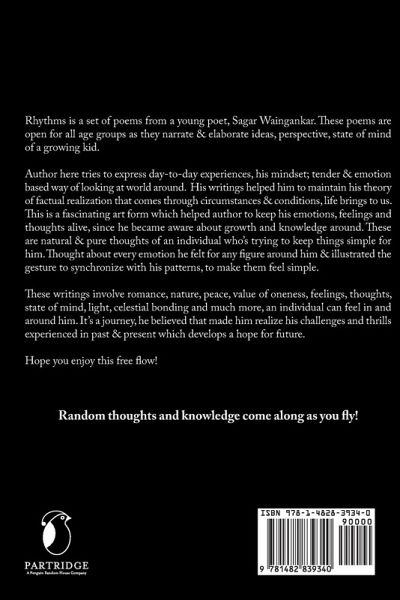 Rhythms is a set of poems from a young poet, Sagar Waingankar. These poems are open for all age groups as they narrate & elaborate ideas, perspective, state of mind of a growing kid. Author here tries to express day-to-day experiences, his mindset; tender & emotion based way of looking at world around. His writings helped him to maintain his theory of factual realization that comes through circumstances & conditions, life brings to us. This is a fascinating art form which helped author to keep his emotions, feelings and thoughts alive, since he became aware about growth and knowledge around. These are natural & pure thoughts of an individual who's trying to keep things simple for him. Thought about every emotion he felt for any figure around him & illustrated the gesture to synchronize with his patterns, to make them feel simple. These writings involve romance, nature, peace, value of oneness, feelings, thoughts, state of mind, light, celestial bonding and much more, an individual can feel in and around him. It's a journey, he believed that made him realize his challenges and thrills experienced in past & present which develops a hope for future. Hope you enjoy this free flow! Random thoughts and knowledge come along as you fly!