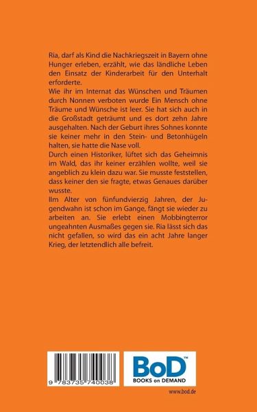 Ria, darf als Kind die Nachkriegszeit in Bayern ohne Hunger erleben, erzählt, wie das ländliche Leben den Einsatz der Kinderarbeit für den Unterhalt erforderte.Wie ihr im Internat das Wünschen und Träumen durch Nonnen verboten wurde. Ein Mensch ohne Träume und Wünsche ist leer. Sie hat sich auch in die Großstadt geträumt und es dort zehn Jahre ausgehalten. Nach der Geburt ihres Sohnes konnte sie keiner mehr in den Stein- und Betonhügeln halten, sie hatte die Nase voll.Durch einen Historiker lüftet sich das Geheimnis im Wald, das ihr keiner erzählen wollte, weil sie angeblich zu klein dazu war. Sie musste feststellen, dass keiner, den sie fragte, etwas Genaues darüber wusste.Im Alter von fünfundvierzig Jahren, der Jugendwahn ist schon im Gange, fängt sie wieder zu arbeiten an. Sie erlebt einen Mobbingterror ungeahnten Ausmaßes. Ria lässt sich das nicht gefallen, so erlebt sie einen acht Jahre langen Krieg, der letztendlich alle befreit.