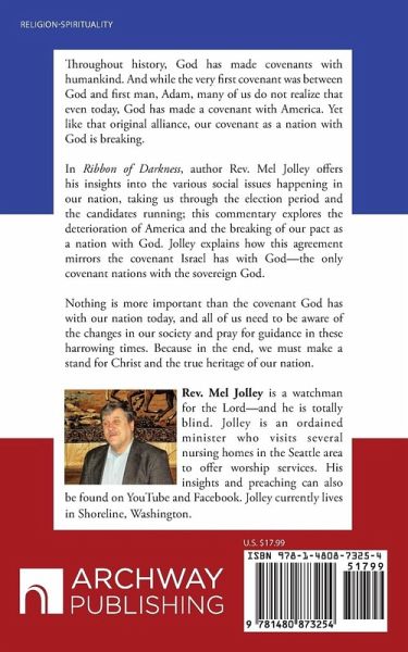 Throughout history, God has made covenants with humankind. And while the very first covenant was between God and first man, Adam, many of us do not realize that even today, God has made a covenant with America. Yet like that original alliance, our covenant as a nation with God is breaking. In Ribbon of Darkness, author Rev. Mel Jolley offers his insights into the various social issues happening in our nation, taking us through the election period and the candidates running; this commentary explores the deterioration of America and the breaking of our pact as a nation with God. Jolley explains how this agreement mirrors the covenant Israel has with God-the only covenant nations with the sovereign God. Nothing is more important than the covenant God has with our nation today, and all of us need to be aware of the changes in our society and pray for guidance in these harrowing times. Because in the end, we must make a stand for Christ and the true heritage of our nation.