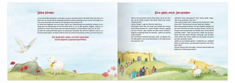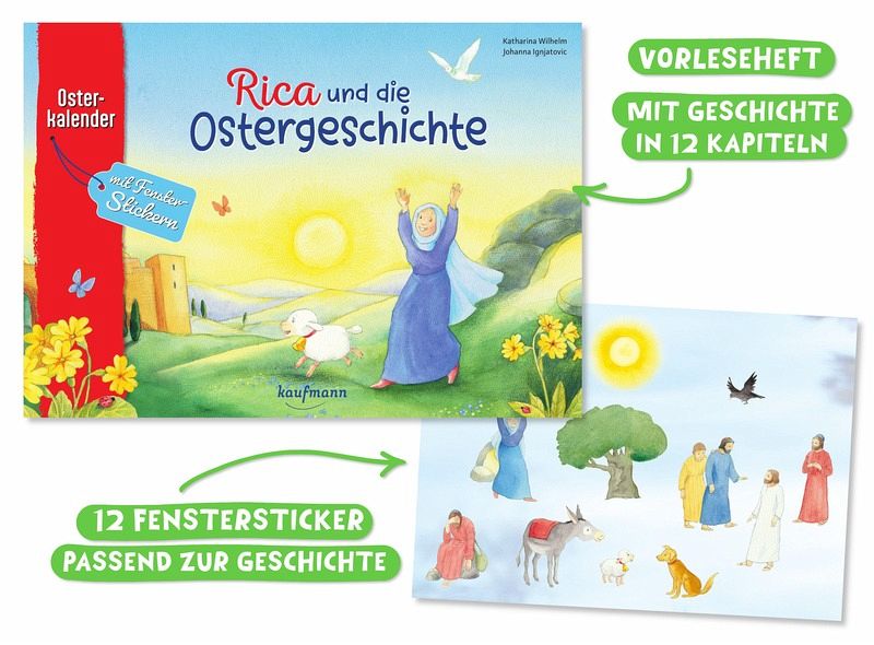 Jedes Kapitel wird von bunten, fröhlichen Illustrationen begleitet, die das Geschehen kindgerecht und verständlich zeigen. Zusätzlich gibt es zu jedem Kapitel ein hochwertiges Folienbild, das am Fenster angebracht werden kann. So entsteht im Laufe der Osterzeit Schritt für Schritt eine vollständige Szenerie rund um Rica und ihre Freunde als Fensterbild - ein kreativer und spielerischer Zugang zur Ostergeschichte, der Kinder begeistert und zum Mitmachen einlädt.