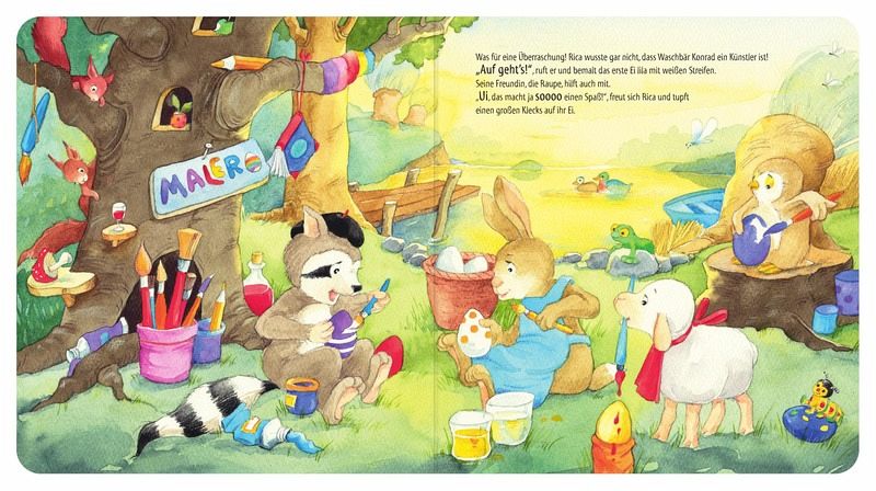 Oh nein, Hase Hoppel hat alle bunten Ostereier zerbrochen! Zum Glück ist das kleine Schaf Rica sofort zur Stelle, um ihm zu helfen. Auch die Hühner, die Eule, das Eichhörnchen, Waschbär Konrad und die kleine Raupe packen mit an. Gemeinsam müsste es den Freunden doch gelingen, das Osterfest zu retten, oder etwa nicht?