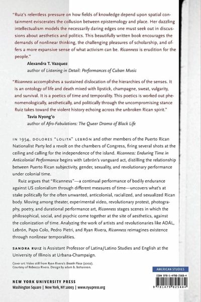 Honorable Mention, 2020 Barnard Hewitt Award for Outstanding Research in Theatre History, given by the American Society for Theatre Research Argues that Ricanness operates as a continual performance of bodily endurance against US colonialism In 1954, Dolores "Lolita" Lebrón and other members of the Puerto Rican Nationalist Party led a revolutionary action on the chambers of Congress, firing several shots at the ceiling and calling for the independence of the island. Ricanness: Enduring Time in Anticolonial Performance begins with Lebrón's vanguard act, distilling the relationship between Puerto Rican subjectivity, gender, sexuality, and revolutionary performance under colonial time. Ruiz argues that Ricanness-a continual performance of bodily endurance against US colonialism through different measures of time-uncovers what's at stake politically for the often unwanted, anticolonial, racialized and sexualized enduring body. Moving among theatre, experimental video, revolutionary protest, photography, poetry, and durational performance art, Ricanness stages scenes in which the philosophical, social, and psychic come together at the site of aesthetics, against the colonization of time. Analyzing the work of artists and revolutionaries like ADÁL, Lebrón, Papo Colo, Pedro Pietri, and Ryan Rivera, Ricanness imagines a Rican future through the time travel extended in their aesthetic interventions, illustrating how they have reformulated time itself through nonlinear aesthetic practices.