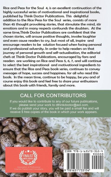 Rice and Peas for the Soul 4 is an excellent continuation of the highly successful series of Rice and Peas for the Soul books, published by Think Doctor Publications. This edition of Rice Peas for the Soul is a compilation of more than 45 excellent short stories that are intended to stimulate, stir and confound. The short stories will certainly stir, arouse, and invoke readers to laugh cry, but most of all encourage readers to be the positive people they are. .