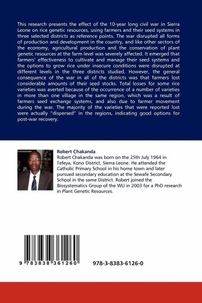 This research presents the effect of the 10-year long civil war in Sierra Leone on rice genetic resources, using farmers and their seed systems in three selected districts as reference points. The war disrupted all forms of production and development in the country, and like other sectors of the economy, agricultural production and the conservation of plant genetic resources at the farm level was severely affected. It emerged that farmers effectiveness to cultivate and manage their seed systems and the options to grow rice under insecure conditions were disrupted at different levels in the three districts studied. However, the general consequence of the war in all of the districts was that farmers lost considerable amounts of their seed stocks. Total losses for some rice varieties was averted because of the occurrence of a number of varieties in more than one village in the same region, which was a result of farmers seed exchange systems, and also due to farmer movement during the war. The majority of the varieties that were reported lost were actually dispersed in the regions, indicating good options for post-war recovery.