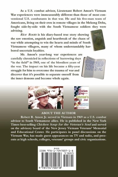 As a U.S. combat advisor, Lieutenant Robert Amon's Vietnam War experiences were immeasurably different than those of most conventional U.S. combatants in that war. He and his five-man team of Americans, living on their own in remote villages in the Mekong Delta, fought side-by-side with the South Vietnamese soldiers they were advising. Rice Roots is his diary-based true story showing the raw emotion, anguish and heartbreak of the chaos of war while attempting to win the hearts and minds of South Vietnamese villagers, many of whom understandably harbored uncertain loyalties. Mr. Amon's year-long war experiences are carefully chronicled in reflections of harrowing days "in the field" in 1969, one of the bloodiest years of the war. The impact on his life became a fifty-year struggle for him to overcome the trauma of war and discover that it's possible to separate oneself from the inner demons, pick up the shattered pieces and become whole again.