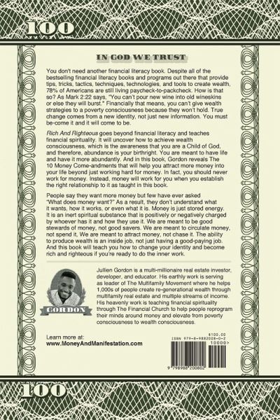 You don't need another financial literacy book. Despite all of the bestselling financial literacy books and programs out there that provide tips, tricks, tactics, techniques, technologies, and tools to create wealth, 78% of Americans are still living paycheck-to-packcheck. How is that so? As Mark 2:22 says, "You can't pour new wine into old wineskins or else they will burst." Financially that means, you can't give wealth strategies to a poverty consciousness because they won't hold. True change comes from a new identity, not just new information. You must be-come it and it will come to be. Rich And Righteous goes beyond financial literacy and teaches financial spirituality. It will uncover how to achieve wealth consciousness, which is the awareness that you are a Child of God, and therefore, abundance is your birthright. You are meant to have life and have it more abundantly. And in this book, Gordon reveals The 10 Money Come-andments that will help you attract more money into your life beyond just working hard for money. In fact, you should never work for money. Instead, money will work for you when you establish the right relationship to it as taught in this book. People say they want more money but few have ever asked "What does money want?" As a result, they don't understand what it wants, how it works, or even what it is. Money is just stored energy. It is an inert spiritual substance that is positively or negatively charged by whoever has it and how they use it. We are meant to be good stewards of money, not good savers.We are meant to circulate money, not sp-end it, We are meant to attract money, not chase it. The ability to produce wealth is an inside job, not just having a good-paying job. And this book will teach you how to change your identity and become rich and righteous if you're ready to do the inner work.