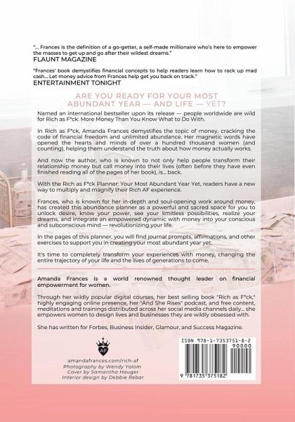 ARE YOU READY FOR YOUR MOST ABUNDANT YEAR - AND LIFE - YET? Named an international best seller upon its release - people worldwide are wild for Rich as F*ck: More Money Than You Know What to Do With. In Rich as F*ck, Amanda Frances demystifies the topic of money, cracking the code of financial freedom and unlimited abundance. Her magnetic words have opened the heart and mind of over a hundred thousand women (and counting), helping them to understand the truth about how money actually works. And now the author who is known to, not only help people transform their relationship money, but call money into their lives(often before they have even finished reading all of the pages of her book), is back. With the Rich as F*ck Planner: Your Most Abundant Year Yet readers have a new way to multiply and magnify their Rich AF experience. Frances, who is known for her in-depth and soul-opening work around money, has created this abundance planner as a powerful and sacred space for you unlock desire, know your power, see your limitless possibilities, realize your dreams, and integrate an empowered dynamic with money into your conscious and subconscious mind - revolutionizing your life. In the pages of the planner you will find journal prompts, affirmations, and other exercises to support you in creating your most abundant year yet. It's time to completely transform your experience with money, changing the entire trajectory of your life. And the lives of generations to come.