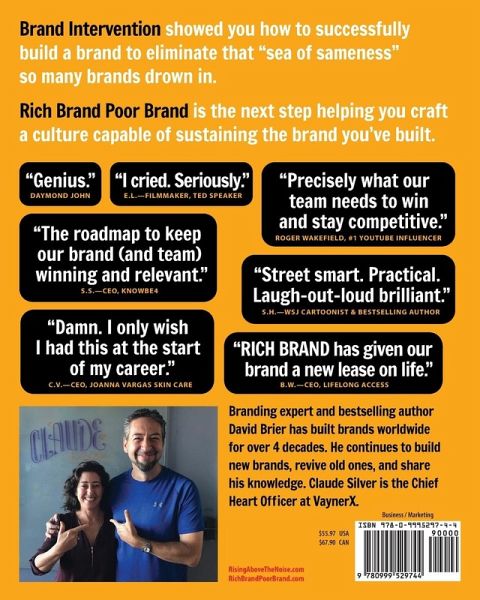 Rich Brand Poor Brand is the follow-up to the #1 Amazon bestseller on branding, Brand Intervention. Rich Brand Poor Brand helps you craft a culture capable of sustaining the brand you've built. It takes the next inevitable step in building a brand that can be maintained, grown, and expanded no matter the size of your company, the number of employees, or the industry you're in. What Rich Brand Poor Brand does is this: It helps founders, CEOs, and entrepreneurs leverage the most powerful asset you won't find on a balance sheet. Yet, it impacts the bottom line of every business. This is a skill you won't learn in business school. And it's why you will find insights from everyone from Warren Buffett to Gary Vaynerchuk, Billy Joel, Coco Chanel, Sara Blakely, Brené Brown, Kevin Hart, Frank Sinatra, Steve Jobs, Daymond John, Frank Zappa, Jason Feifer, and Jim Rohn. This is the Holy Grail for overachievers. Within reach but often missed by a mile. This is the magic ingredient that made everything from the Seinfeld sitcom to The Rolling Stones, Pay Pal to The Rat Pack, and Motown and the Declaration of Independence not only possible-but inevitable. This is what Rich Brand Poor Brand is all about, tapping into that reservoir of brilliance that's staring you in the face-to build a brand the world needs and wants. Filled with stunning artwork throughout, this is an example of how to bring a brand and its message to life. The book concludes with the Rich Brand Poor Brand Playbook, 46 eye-popping pages of full-color artwork with real-world examples showing these principles in action. Get a front-row seat and see the transformation these brands have gone through, not only impacting the companies they serve but also the people responsible for the brand and its story in the world of business. This is the "secret sauce" that's remained elusive in the real world of business and life, finally broken down into bite-size chunks for immediate use. Foreword by Claude Silver, Chief Heart Officer of VaynerX.