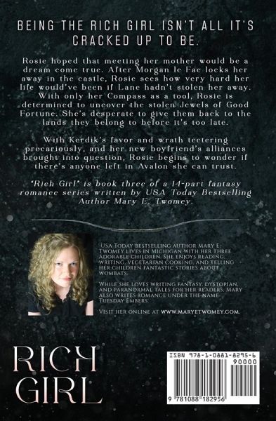 Being the rich girl isn't all it's cracked up to be. Rosie hoped that meeting her mother would be a dream come true. After Morgan le Fae locks her away in the castle, Rosie sees how very hard her life would've been if Lane hadn't stolen her away. With only her Compass as a tool, Rosie is determined to uncover the stolen Jewels of Good Fortune. She's desperate to give them back to the lands they belong to before it's too late. With Kerdik's favor and wrath teetering precariously, and her new boyfriend's alliances brought into question, Rosie begins to wonder if there's anyone left in Avalon she can trust. "Rich Girl" is book three of a 14-part fantasy romance series written by USA Today Bestselling Author Mary E. Twomey.