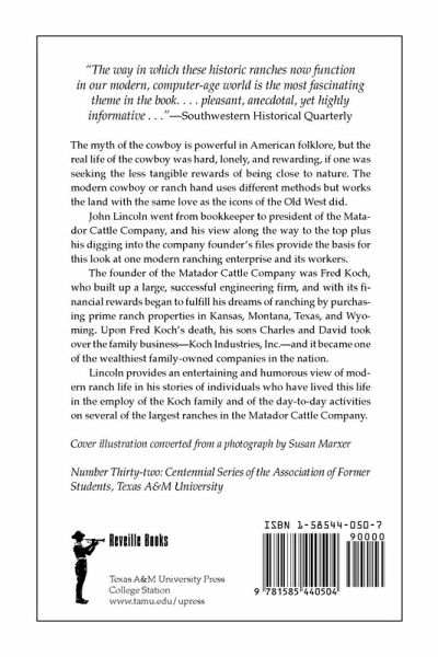 The myth of the cowboy is powerful in American folklore, but the real life of the cowboy was hard, lonely, and rewarding, if one was seeking the less tangible rewards of being close to nature. The modern cowboy or ranch hand uses different methods but works the land with the same love as the icons of the Old West did. John Lincoln went from bookkeeper to president of the Matador Cattle Company, and his view along the way to the top plus his digging into the company founder's files provide the basis for this look at one modern ranching enterprise and its workers. The founder of the Matador Cattle Company was Fred Koch, who built up a large, successful engineering firm, and with its financial rewards began to fulfill his dreams of ranching by purchasing prime ranch properties in Kansas, Montana, Texas, and Wyoming. Upon Fred Koch's death, his sons Charles and David took over the family business--Koch Industries, Inc.--and it became one of the wealthiest family-owned companies in the nation. Lincoln provides an entertaining and humorous view of modern ranch life in his stories of individuals who have lived this life in the employ of the Koch family and of the day-to-day activities on several of the largest ranches in the Matador Cattle Company. His love for the land and its caretakers comes through in his words and urges that anyone with dedication and willingness to work hard can live close to beauty and nature by working on a ranch.