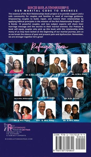Welcome to Rich Relationships Our Marital Code To Oneness REFUGE TEAM A power-packed work of art. Get ready to immerse yourself into every aspect of marriage and its impact on couples and family. An exciting collaboration of excellence; as each pair of partners takes you through their journey and how they navigated the ebb and flow of love, sex, money, and all that comes with their union.The essence of the Rich Relationships book project is to provide support and a safe community for couples and families in need of marriage guidance. Empowering couples to build, repair, and restore their relationships by applying biblical principles is the Rich Relationship project's mission. Gil and Renée, 10 powerful couples, and two subject experts will share their marriage message and the secrets to their marital oneness. The Rich Relationship podcast and this book will help couples with the relationship skills they may have lacked at the beginning of their marital journey. It is time to break the silence of past and present pain and dysfunction.Remember, we are stronger together; let's grow.