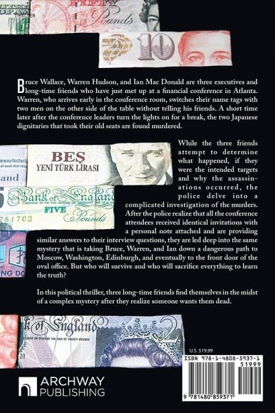 Bruce Wallace, Warren Hudson, and Ian Mac Donald are three executives and long-time friends who have just met up at a financial conference in Atlanta. Warren, who arrives early in the conference room, switches their name tags with two men on the other side of the table without telling his friends. A short time later after the conference leaders turn the lights on for a break, the two Japanese dignitaries that took their old seats are found murdered. While the three friends attempt to determine what happened, if they were the intended targets and why the assassinations occurred, the police delve into a complicated investigation of the murders. After the police realize that all the conference attendees received identical invitations with a personal note attached and are providing similar answers to their interview questions, they are led deep into the same mystery that is taking Bruce, Warren, and Ian down a dangerous path to Moscow, Washington, Edinburgh, and eventually to the front door of the oval office. But who will survive and who will sacrifice everything to learn the truth? In this political thriller, three long-time friends find themselves in the midst of a complex mystery after they realize someone wants them dead.
