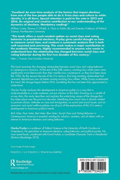 This book examines the changing relationship between social class and voting behavior in contemporary America. At the end of the 20th century, working-class white voters were significantly more Democratic than their middle-class counterparts, as they had been since the 1930s. By the second decade of the 21st century, that long-standing relationship had reversed: Republicans now do better among working-class whites. While Trump accentuated this trend, the change began before 2016, something that has not been fully appreciated or understood. Charles Prysby analyzes this development in American politics in a way that is understandable to a wide audience, not just scholars in this field. Drawing on a wealth of survey data, this study describes and explains the underlying causes of the change that has taken place over the past two decades, identifying how social class is directly related to partisan choice. Attitudes on race and immigration, on social and moral issues, and on economic and social welfare policies are all part of the explanation of this 21st century development in American political trends. Rich Voter, Poor Voter, Red Voter, Blue Voter: Social Class and Voting Behavior in Contemporary America is essential reading for scholars, students, and all others with an interest in American elections and voting behavior.