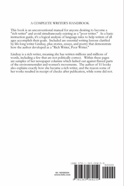 This book is an unconventional manual for anyone desiring to become a "rich writer" and avoid simultaneously existing as a "poor writer." As a basic instruction guide, it's a logical analysis of language rules to help writers of all ages accomplish their goals. Included are essential writing lessons clarified by life-long writer Lindsay, plus stories, essays, and poetry that demonstrate how the author developed as a "Rich Writer, Poor Writer." Lindsay is a rich writer, meaning she has written millions and millions of words, including a few that are not politically correct. Within these pages are samples of her newspaper columns which lashed out against flawed parts of the environmentalist and women's movements. The author of 11 books also explains exactly how she became a rich writer, and the reason some of her works resulted in receipt of checks after publication, while some did not.
