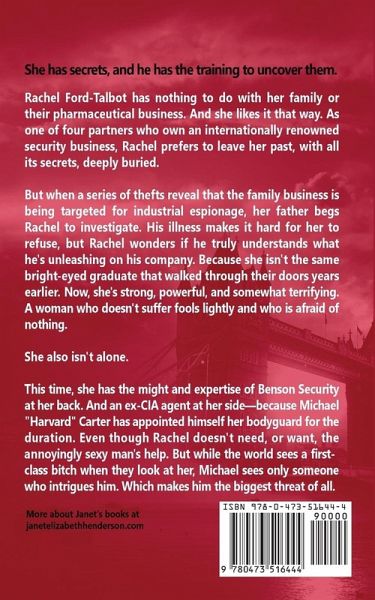 She has secrets, and he has the training to uncover them. Rachel Ford-Talbot has nothing to do with her family or their pharmaceutical business. And she likes it that way. As one of four partners who own an internationally renowned security business, Rachel prefers to leave her past, with all its secrets, deeply buried. But when a series of thefts reveal that the family business is being targeted for industrial espionage, her father begs Rachel to investigate. His illness makes it hard for her to refuse, but Rachel wonders if he truly understands what he's unleashing on his company. Because she isn't the same bright-eyed graduate that walked through their doors years earlier. Now, she's strong, powerful, and somewhat terrifying. A woman who doesn't suffer fools lightly and who is afraid of nothing. She also isn't alone. This time, she has the might and expertise of Benson Security at her back. And an ex-CIA agent at her side-because Michael "Harvard" Carter has appointed himself her bodyguard for the duration. Even though Rachel doesn't need, or want, the annoyingly sexy man's help. But while the world sees a first-class bitch when they look at her, Michael sees only someone who intrigues him. Which makes him the biggest threat of all.