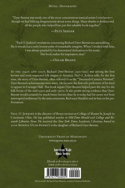 In the 1940s and '50s, Richard Dyer-Bennet (1913-1991) was among the best known and most respected folk singers in America. Paul O. Jenkins tells, for the first time, the story of Dyer-Bennet, often referred to as the "Twentieth-Century Minstrel." Dyer-Bennet's approach to singing sounded almost foreign to many American listeners. The folk artist followed a musical tradition in danger of dying out. The Swede Sven Scholander was the last European proponent of minstrelsy and served as Dyer-Bennet's inspiration after the young singer traveled to Stockholm to meet him one year before Scholander's death. Dyer-Bennet's achievements were many. Nine years after his meeting with Scholander, he became the first solo performer of his kind to appear in Carnegie Hall. This book argues Dyer- Bennet helped pave the way for the folk boom of the mid-1950s and early 1960s, finding his influence in the work of Joan Baez, Judy Collins, and many others. It also posits strong evidence that Dyer-Bennet would certainly be much better known today had his career not been interrupted midstream by the anticommunist, Red-scare blacklist and its ban on his performances.