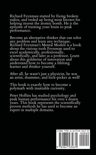 How a kid with a broken radio became one of the world's finest minds. Richard Feynman started by fixing broken radios, and ended up being most known for helping invent the atomic bomb. He is the epitome of training your brain to peak performance. Become an alternative thinker that can solve any problem and learn any technique. Richard Feynman's Mental Models is a book about the various tools Feynman used to excel academically, professionally, scientifically, and later as a professor. Learn about this goldmine of innovation and understand how to become a lifelong learner and thinker yourself. This is a book like no other - together, we will analyze the roots of Feynman's upbringing, the genesis of his most well-known mental models, and exactly how to apply them in all areas of your life. After all, he wasn't just a physicist, he was an artist, drummer, and lock-picker as well! This book is exactly how to become a polymath with insatiable curiosity. Peter Hollins has studied psychology and peak human performance for over a dozen years. This book represents the scientifically proven methods he has used to become an expert in multiple domains. Build your intellectual horsepower - yes, it is possible! - Feynman's 12 favorite problems framework and how to solve any area of your life - the Feynman Technique and how to comprehend extremely complex concepts - the virtues of play and imagination in solving problems - intellectual humility and getting from Point A to Point B -how to spark curiosity in all of your endeavors The scientific mindset is the key to the next level of your life.