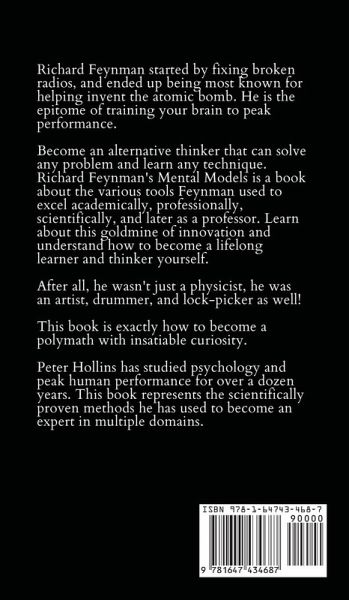 How a kid with a broken radio became one of the world's finest minds. Richard Feynman started by fixing broken radios, and ended up being most known for helping invent the atomic bomb. He is the epitome of training your brain to peak performance. Become an alternative thinker that can solve any problem and learn any technique. Richard Feynman's Mental Models is a book about the various tools Feynman used to excel academically, professionally, scientifically, and later as a professor. Learn about this goldmine of innovation and understand how to become a lifelong learner and thinker yourself. This is a book like no other - together, we will analyze the roots of Feynman's upbringing, the genesis of his most well-known mental models, and exactly how to apply them in all areas of your life. After all, he wasn't just a physicist, he was an artist, drummer, and lock-picker as well! This book is exactly how to become a polymath with insatiable curiosity. Peter Hollins has studied psychology and peak human performance for over a dozen years. This book represents the scientifically proven methods he has used to become an expert in multiple domains. Build your intellectual horsepower - yes, it is possible! - Feynman's 12 favorite problems framework and how to solve any area of your life - the Feynman Technique and how to comprehend extremely complex concepts - the virtues of play and imagination in solving problems - intellectual humility and getting from Point A to Point B -how to spark curiosity in all of your endeavors The scientific mindset is the key to the next level of your life.