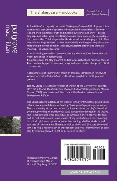 This Handbook provides an introductory guide to'Richard II'offering a scene-by-scene theatrically aware commentary, contextual documents, a brief history of the text and first performances, case studies of three or four key performances and productions, a survey of film and TV adaptations, a wide sampling of critical opinion and further reading.