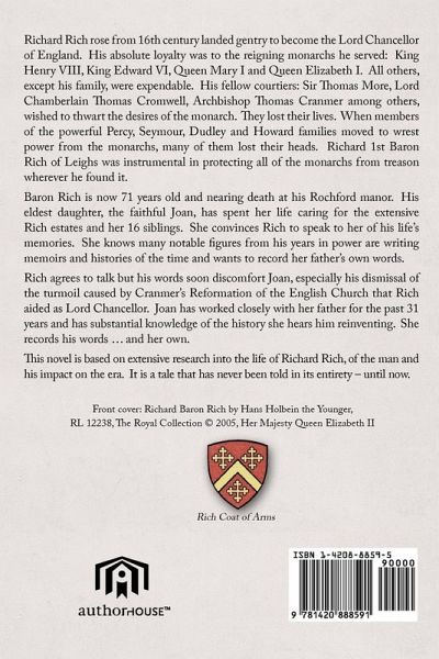 Richard Rich rose from 16th century landed gentry to become the Lord Chancellor of England. His absolute loyalty was to the reigning monarchs he served: King Henry VIII, King Edward VI, Queen Mary I and Queen Elizabeth I. All others, except his family, were expendable. His fellow courtiers: Sir Thomas More, Lord Chamberlain Thomas Cromwell, Archbishop Thomas Cranmer among others, wished to thwart the desires of the monarch. They lost their lives. When members of the powerful Percy, Seymour, Dudley and Howard families moved to wrest power from the monarchs, many of them lost their heads. Richard 1st Baron Rich of Leighs was instrumental in protecting all of the monarchs from treason wherever he found it. Baron Rich is now 71 years old and nearing death at his Rochford manor. His eldest daughter, the faithful Joan, has spent her life caring for the extensive Rich estates and her 16 siblings. She convinces Rich to speak to her of his life's memories. She knows many notable figures from his years in power are writing memoirs and histories of the time and wants to record her father's own words. Rich agrees to talk but his words soon discomfort Joan, especially his dismissal of the turmoil caused by Cranmer's Reformation of the English Church that Rich aided as Lord Chancellor. Joan has worked closely with her father for the past 31 years and has substantial knowledge of the history she hears him reinventing. She records his words . and her own. This novel is based on extensive research into the life of Richard Rich, of the man and his impact on the era. It is a tale that has never been told in its entirety - until now.