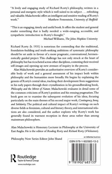 Richard Rorty is notorious for contending that the traditional, foundation-building and truth-seeking ambitions of systematic philosophy should be set aside in favour of a more pragmatic, conversational, hermeneutically guided project. This challenge has not only struck at the heart of philosophy but has ricocheted across other disciplines, both contesting their received self-images and opening up new avenues of inquiry in the process. Alan Malachowski provides an authoritative overview of Rorty's considerable body of work and a general assessment of his impact both within philosophy and in the humanities more broadly. He begins by explaining the genesis of Rorty's central ideas, tracking their development from suggestions in his early papers through their crystallization in his groundbreaking book, "Philosophy and the Mirror of Nature". Malachowski evaluates some of the common criticisms of Rorty's position and his ensuing pragmatism. The book examines the subsequent evolution of his ideas, focusing particularly on the main themes of his second major work, Contingency, Irony, and Solidarity. The political and cultural impact of Rorty's writings on such diverse fields as feminism, cultural and literary theory, and international relations are also considered, and the author explores why Rorty's work has generally found its warmest reception in these areas rather than among mainstream philosophers.